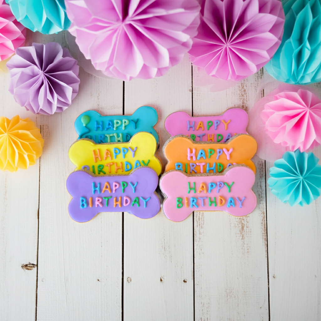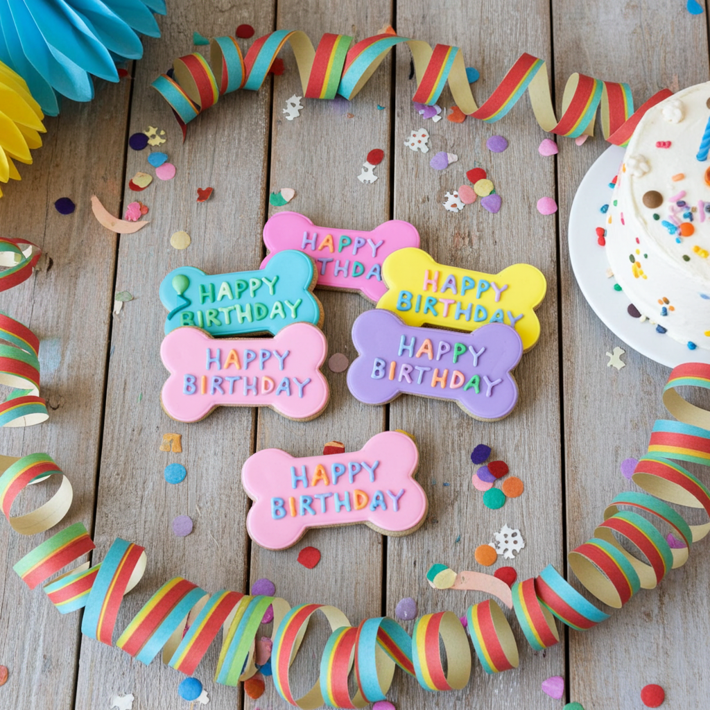 Cheers to your furry friend's barkday with our Large Happy Birthday Day Bones! This assorted set of 12 bones comes in a mix of pink and blue bones. The perfect way to celebrate your pup's special day! Because every dog deserves a celebration!