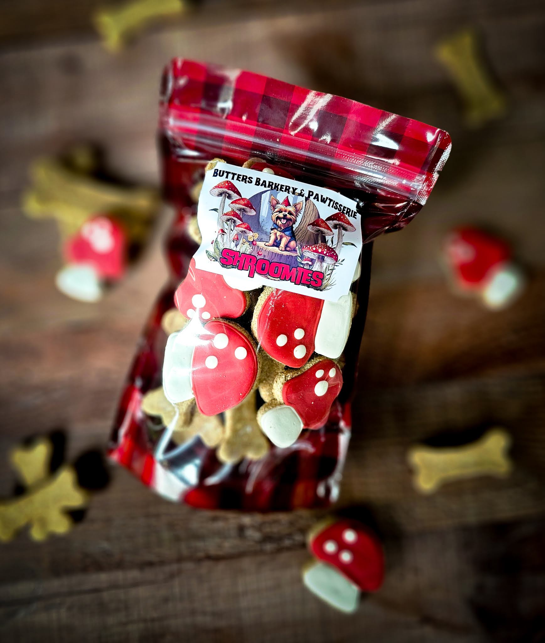 Give your furry friend a taste of the woodland with our mini mushrooms decorated cookie bag filled with decorated mini mushrooms and bone shaped treats. Your dog will be begging for more! (Seriously, they'll be wagging their tail for days!)